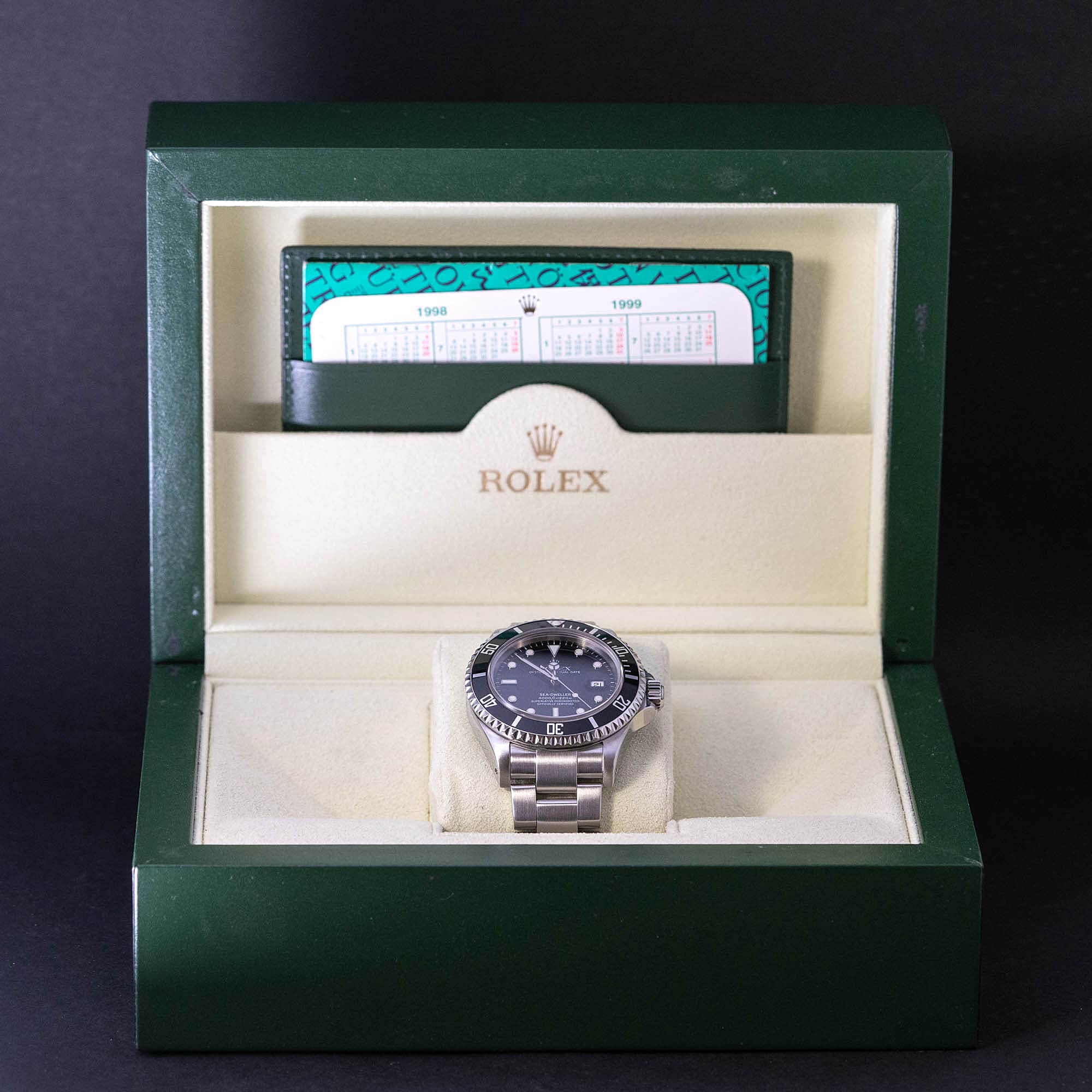 Rolex Oyster Perpetual Sea-Dweller 16600. A-sarjaa vuodelta 1999. Hyväkuntoinen teräskuori ja virheetön musta bezel luminova-dotilla. Alkuperäinen ja huippukuntoinen musta luminova kellotaulu ja -osoittimet.