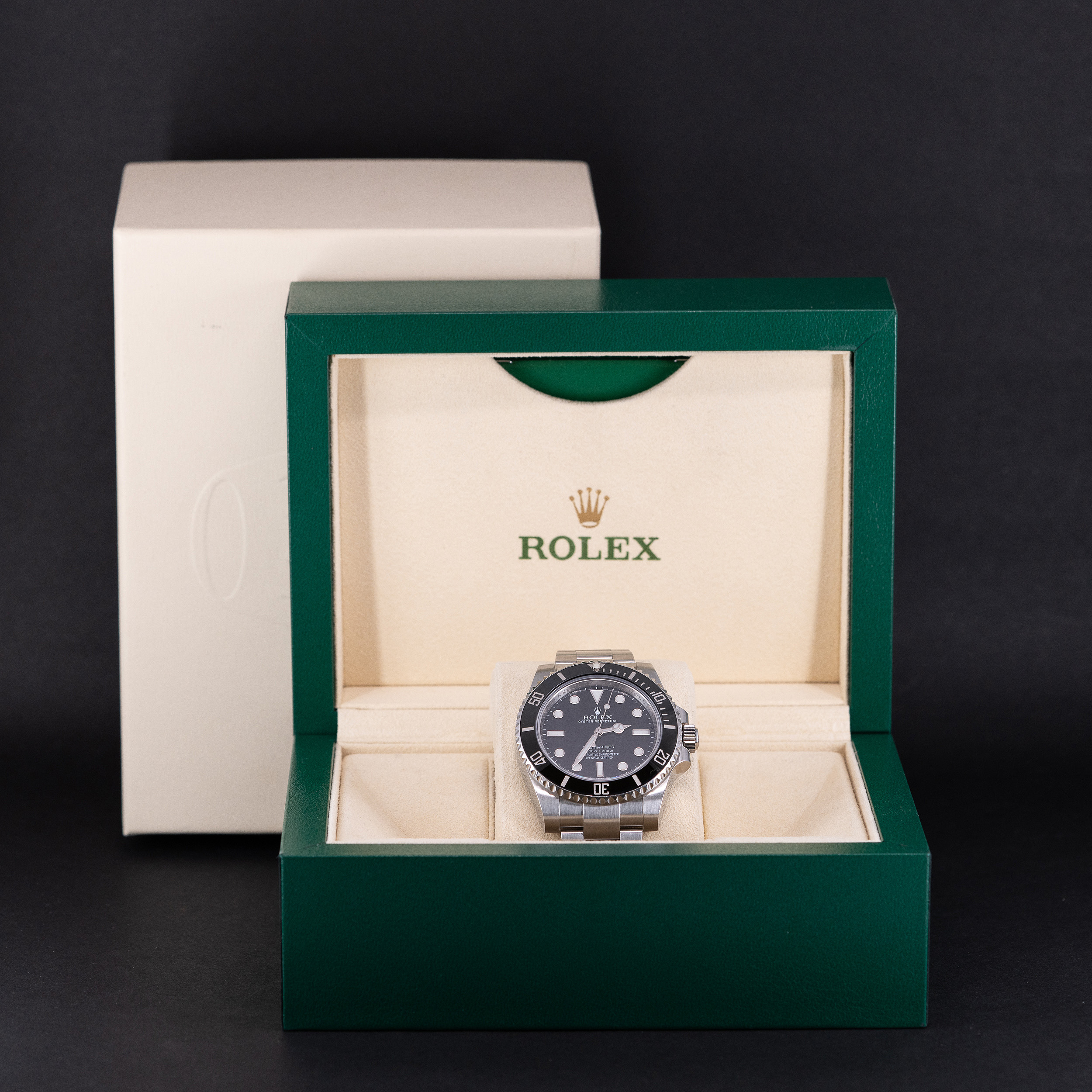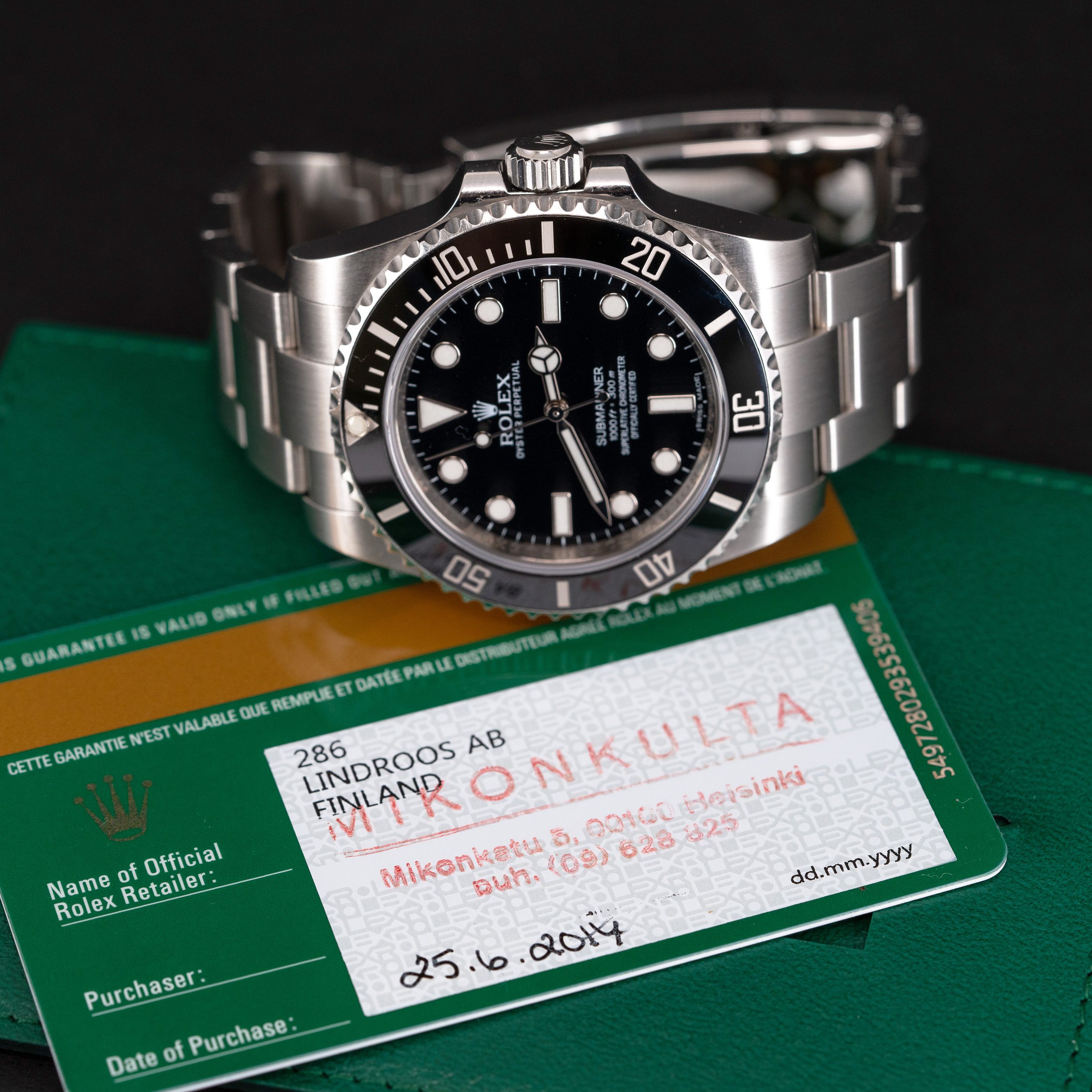 Rolex Oyster Perpetual Submariner 114060 vuodelta 2014. Suomikello, full-set. Kellossa on virheetön musta Chromalight kellotaulu ja -osoittimet. Virheetön keraaminen lasisarja. Teräskuori on erittäin hyvässä kunnossa ja sukellustiivis, testattu +10/-0,7bar. Kuoren koko on 40mm.