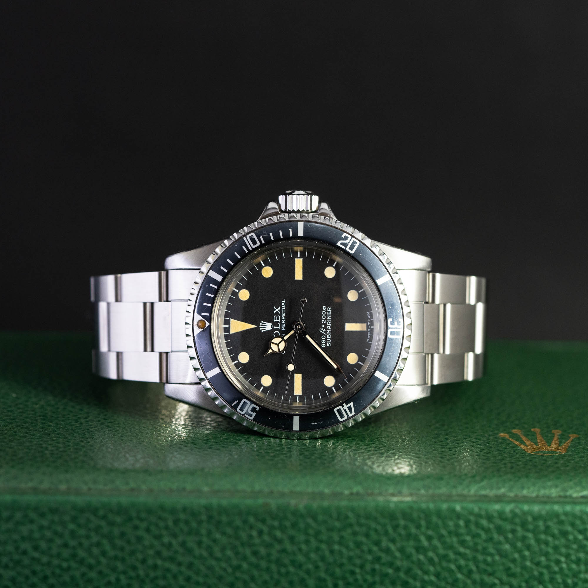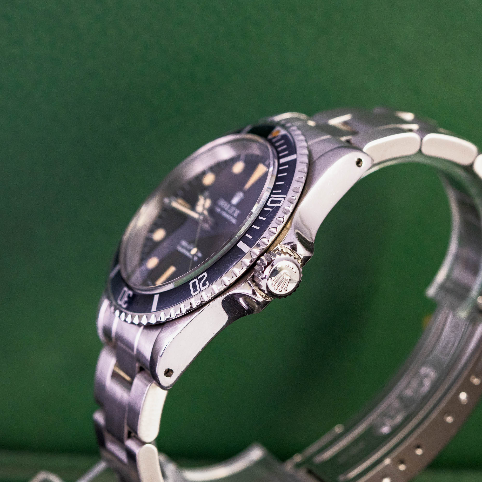 Hieno Rolex Oyster Perpetual Submariner ref. 5513 vuodelta 1978. Sn. 511xxxx. Alkuperäinen musta Singerin valmistama non-serif matta musta tritium-kellotaulu ja alkuperäiset tritium osoittimet. Alkuperäinen musta bezel pienellä lume-pisteellä. Kellotaulun ja osoittimien tritium on kauniisti ikääntynyt.