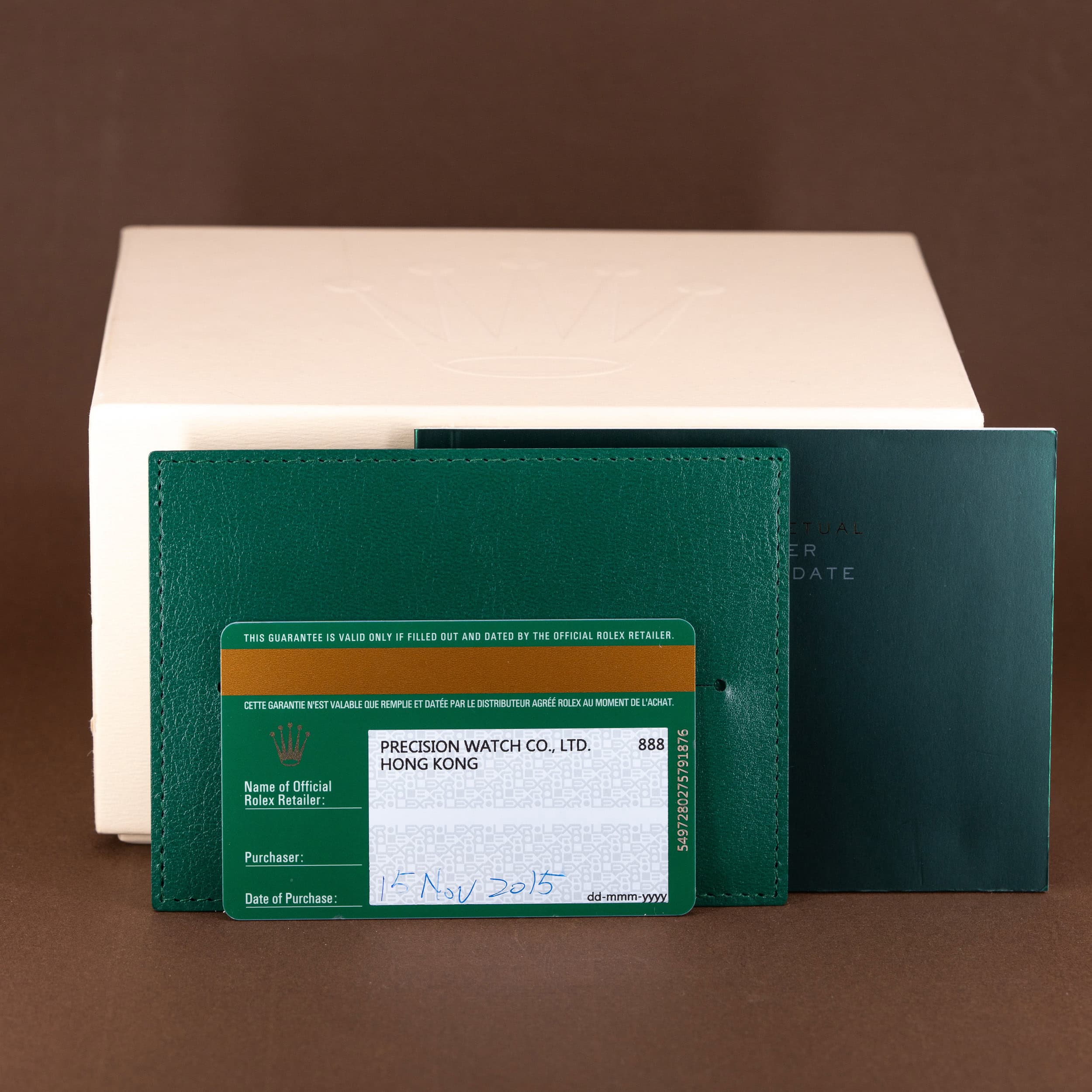 Kellon mukana tulee kaikki alkuperäisen myyntikokonaisuuden osat: molemmat laatikot (sisä ja ulko), takuukortti, käyttöohjeet, molemmat tägit sekä Rolexin huoltotakuu vihko ja kortti.