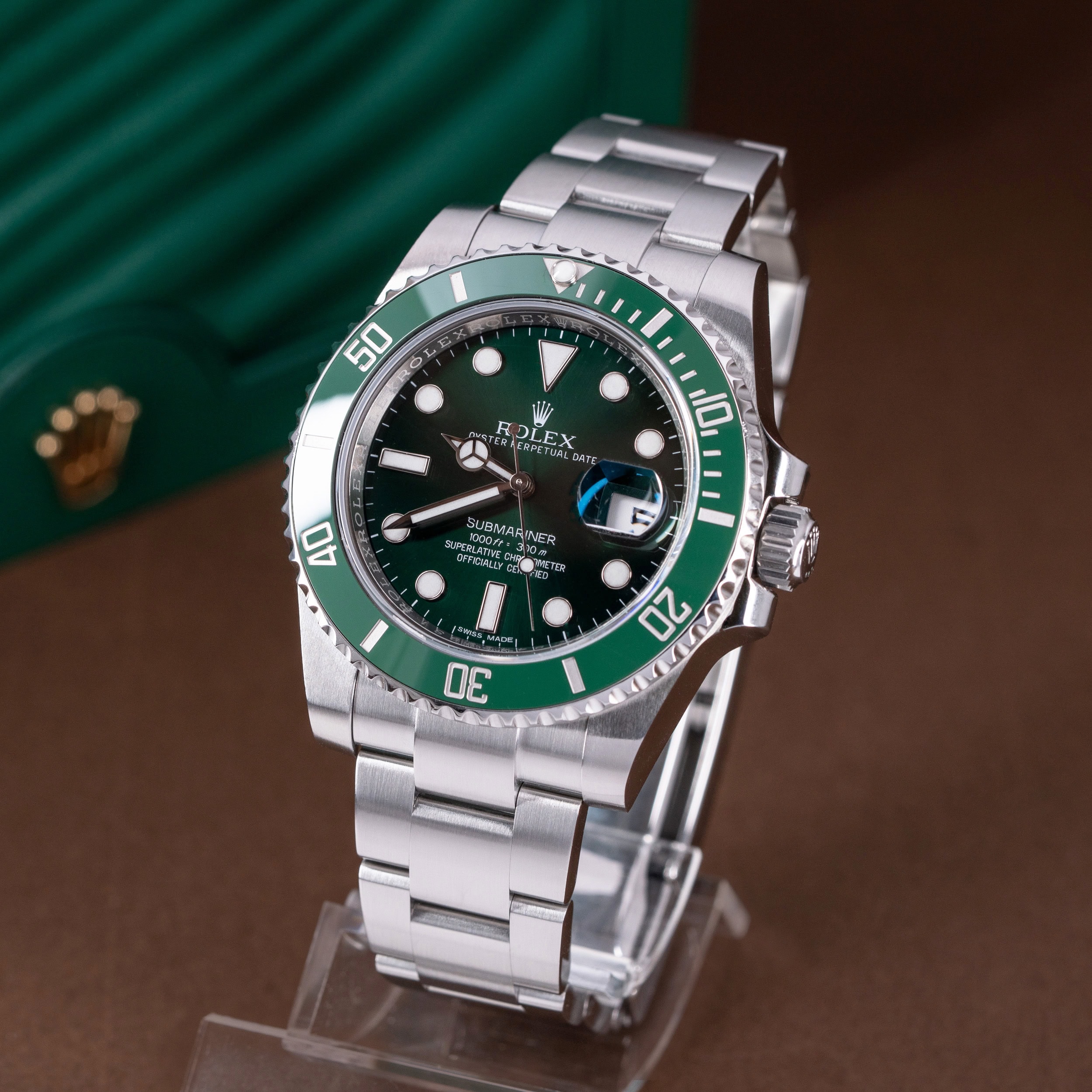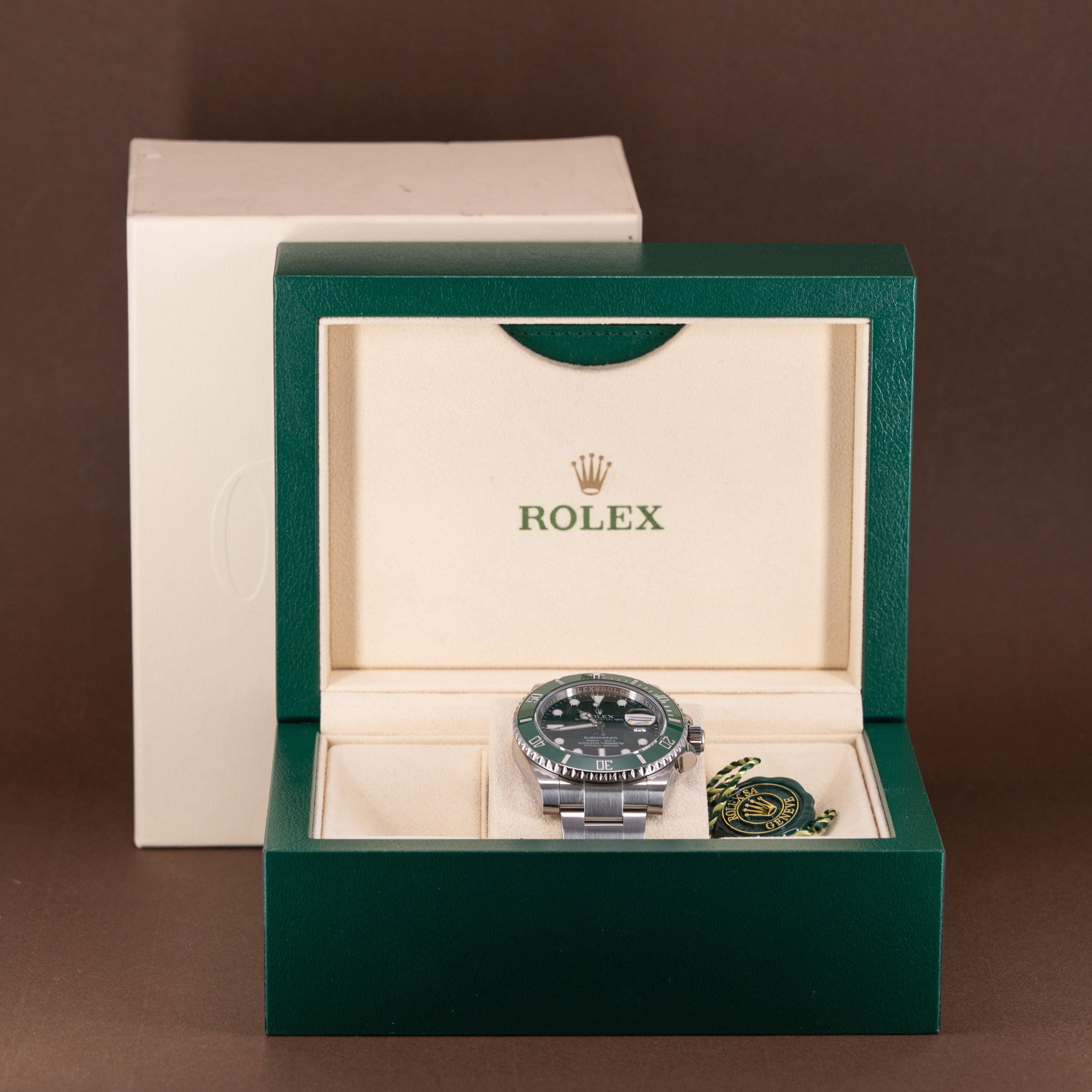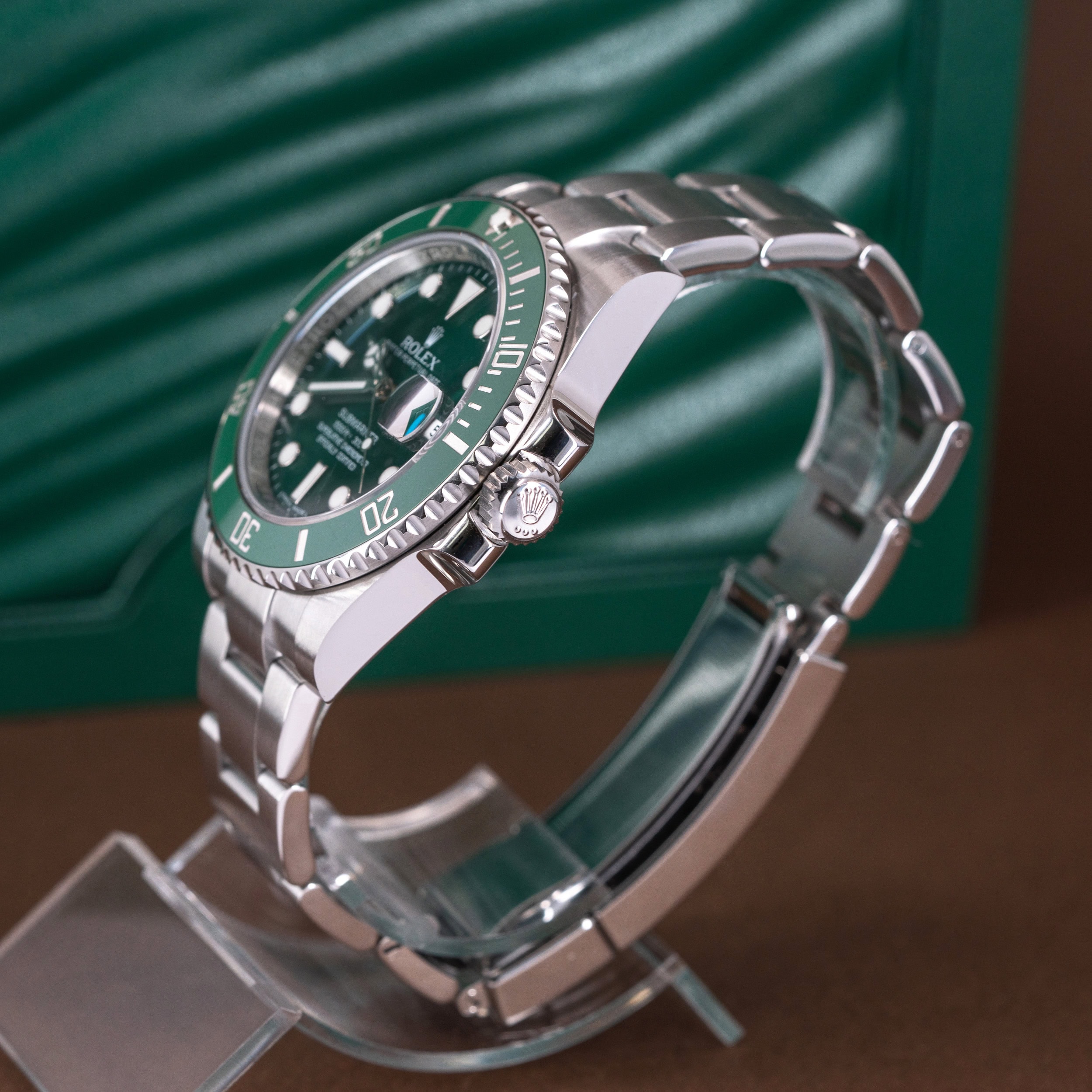 Huippukuntoinen Rolex Oyster Perpetual Submariner “Hulk” 116610LV vuodelta 2015. Full set, kaikki laatikot ja paperit.