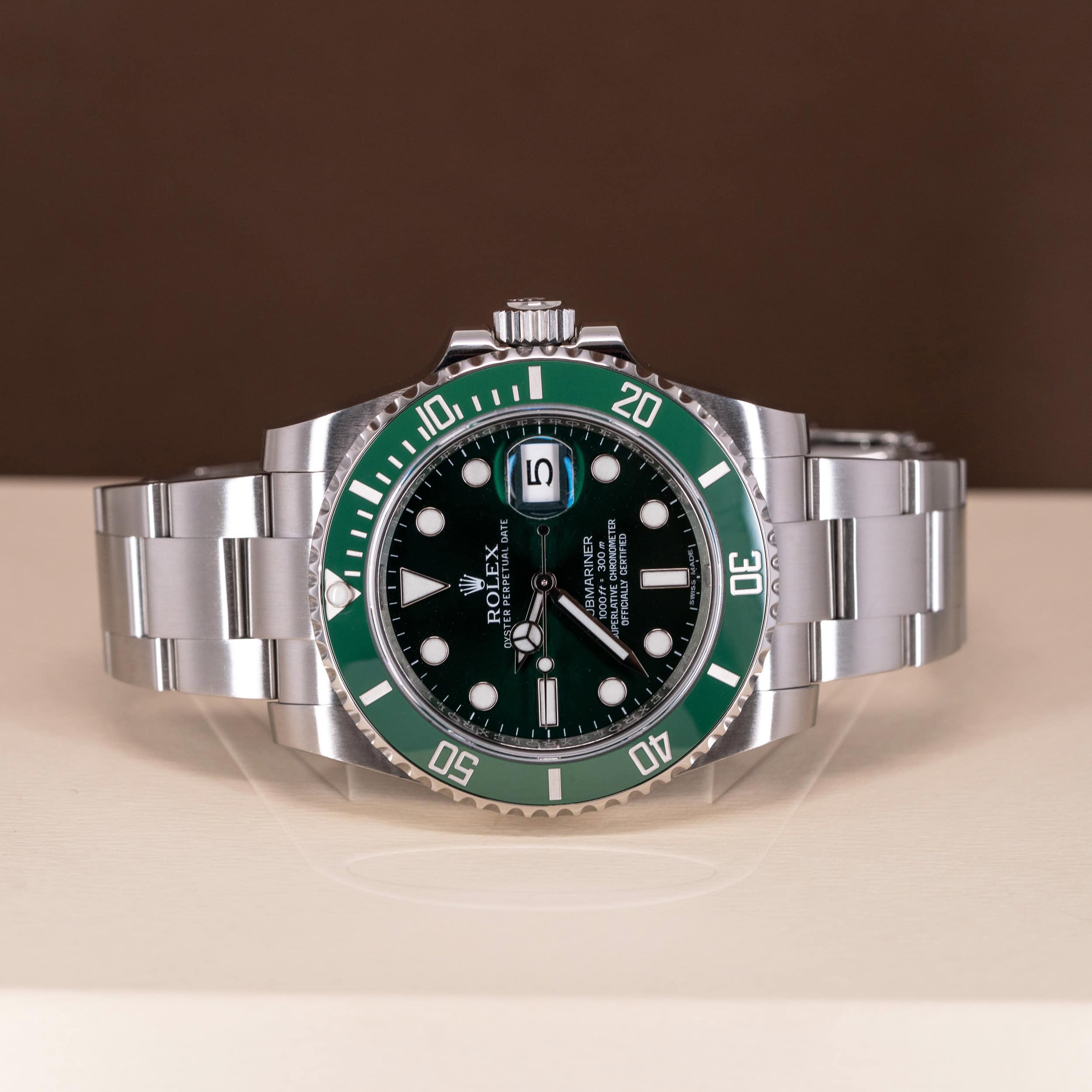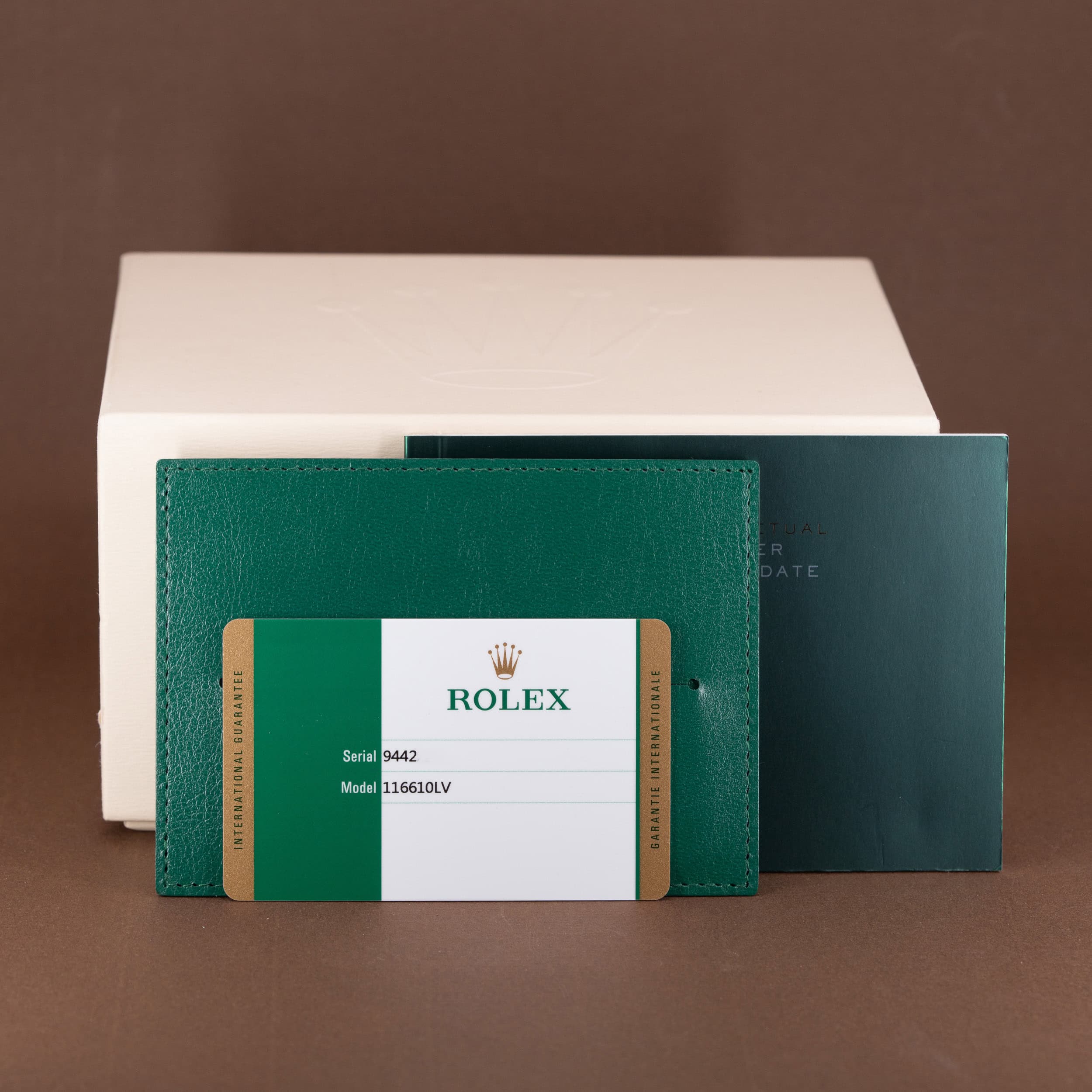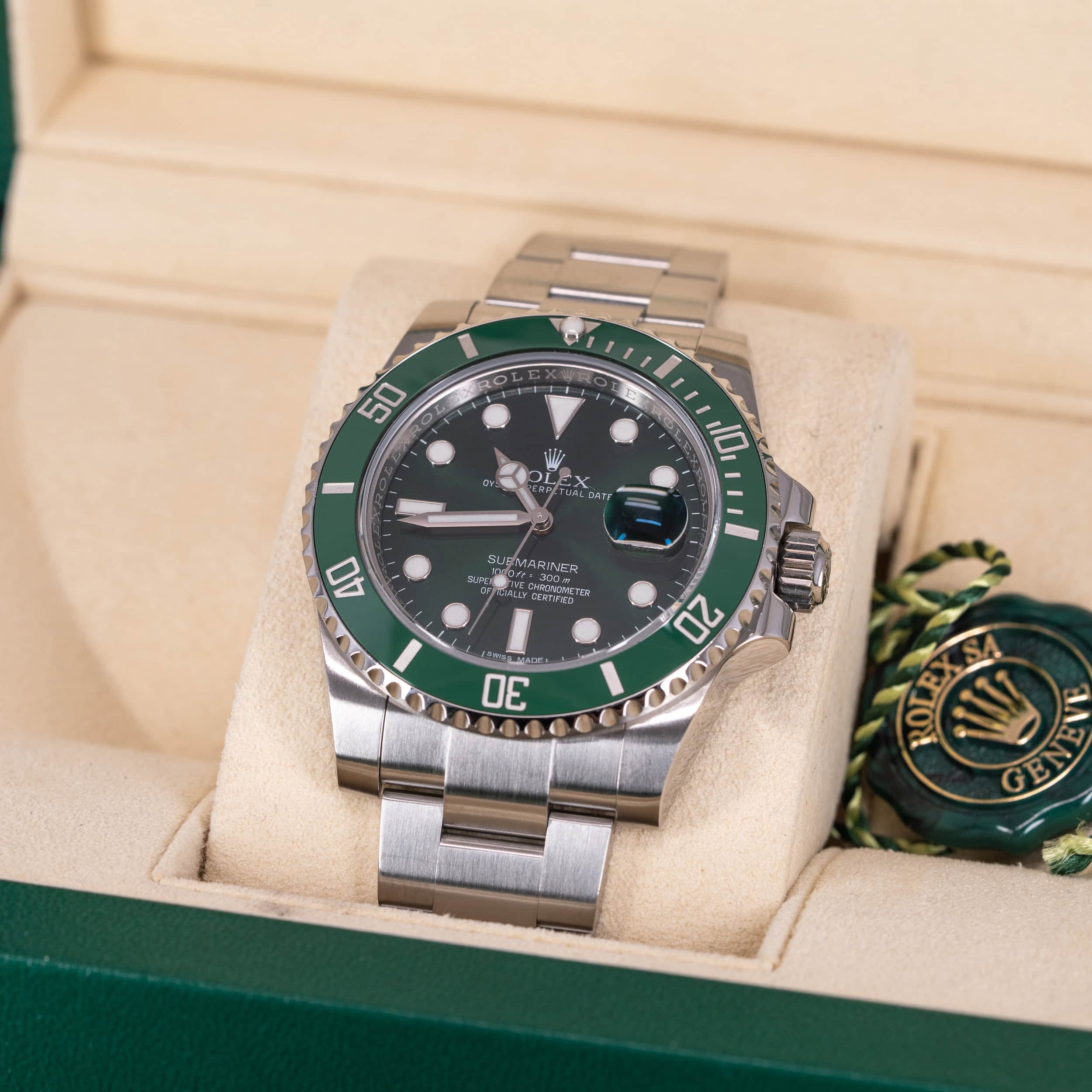 Huippukuntoinen Rolex Oyster Perpetual Submariner “Hulk” 116610LV vuodelta 2015. Full set, kaikki laatikot ja paperit.
