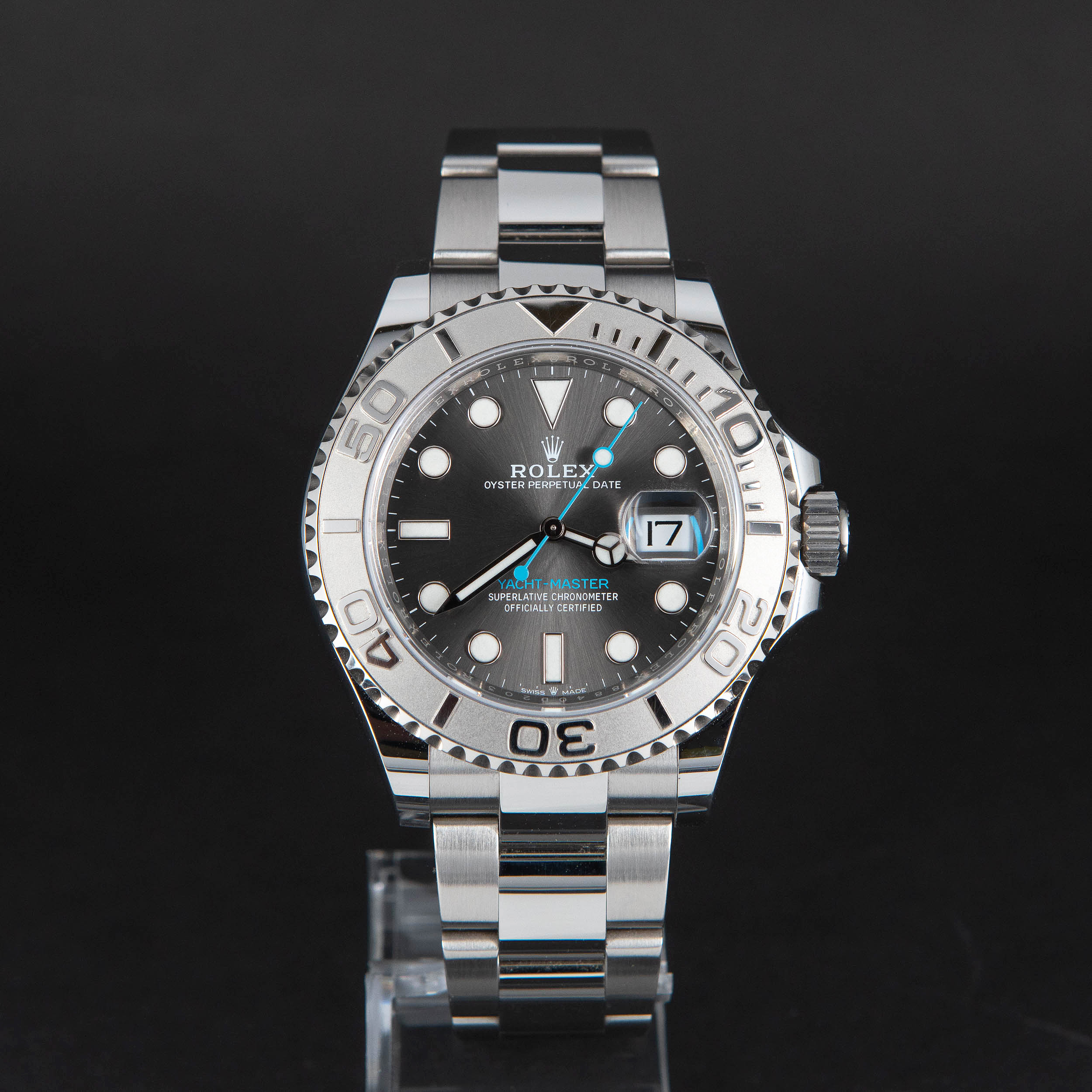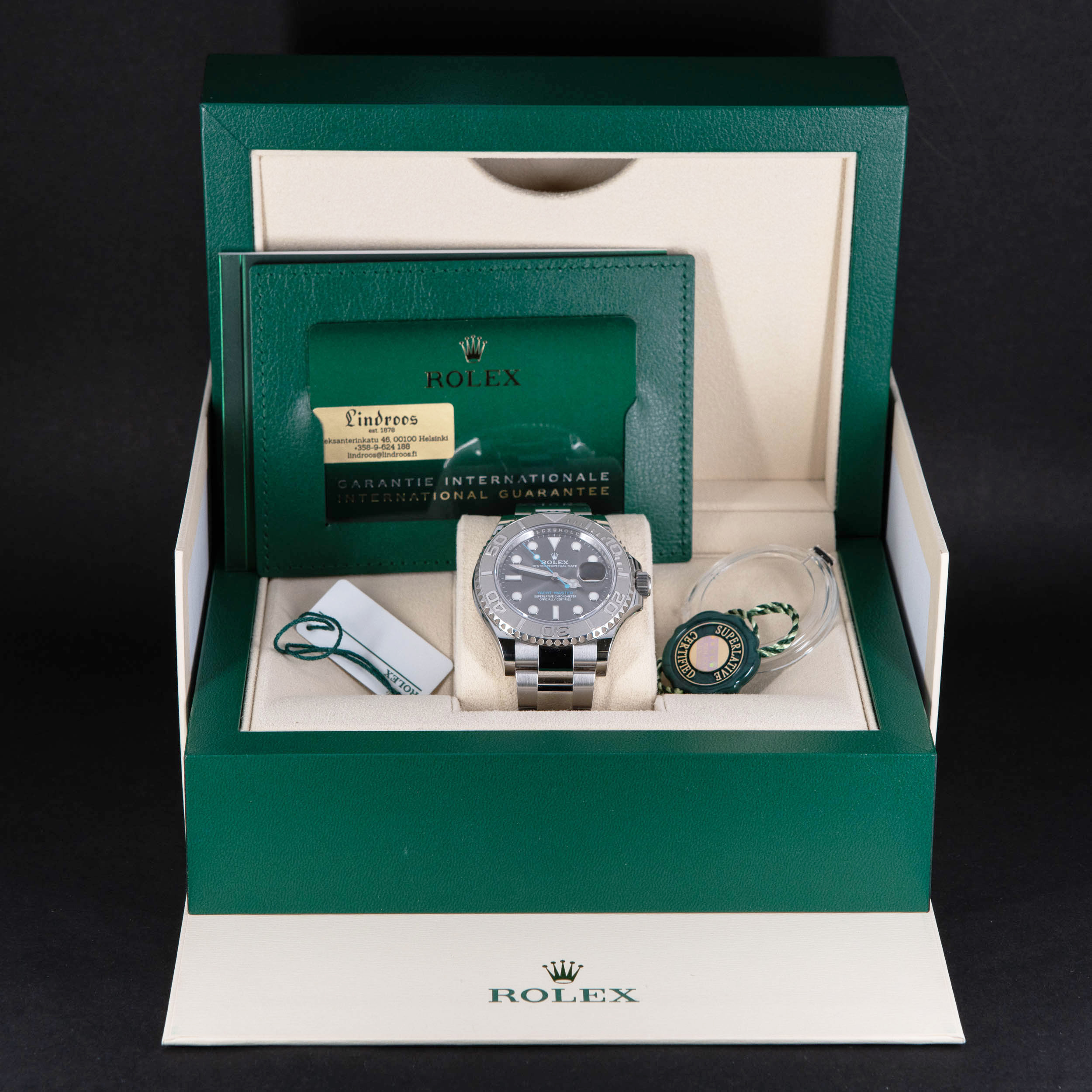 Rolex Yacht-Master 40 126622 vuodelta 2021. Ostettu Lindroosilta 2/2021. Full-set, kaikki alkuperäiset laatikot ja paperit. Lähes uudenveroinen yksilö, hyvin pieniä käytön jälkiä. Alkuperäinen harmaa slate-värinen kellotaulu. Teräksen ja vaaleansiniset osoittimet Chromalight loistemassalla. 950 Rodium lasisarja.