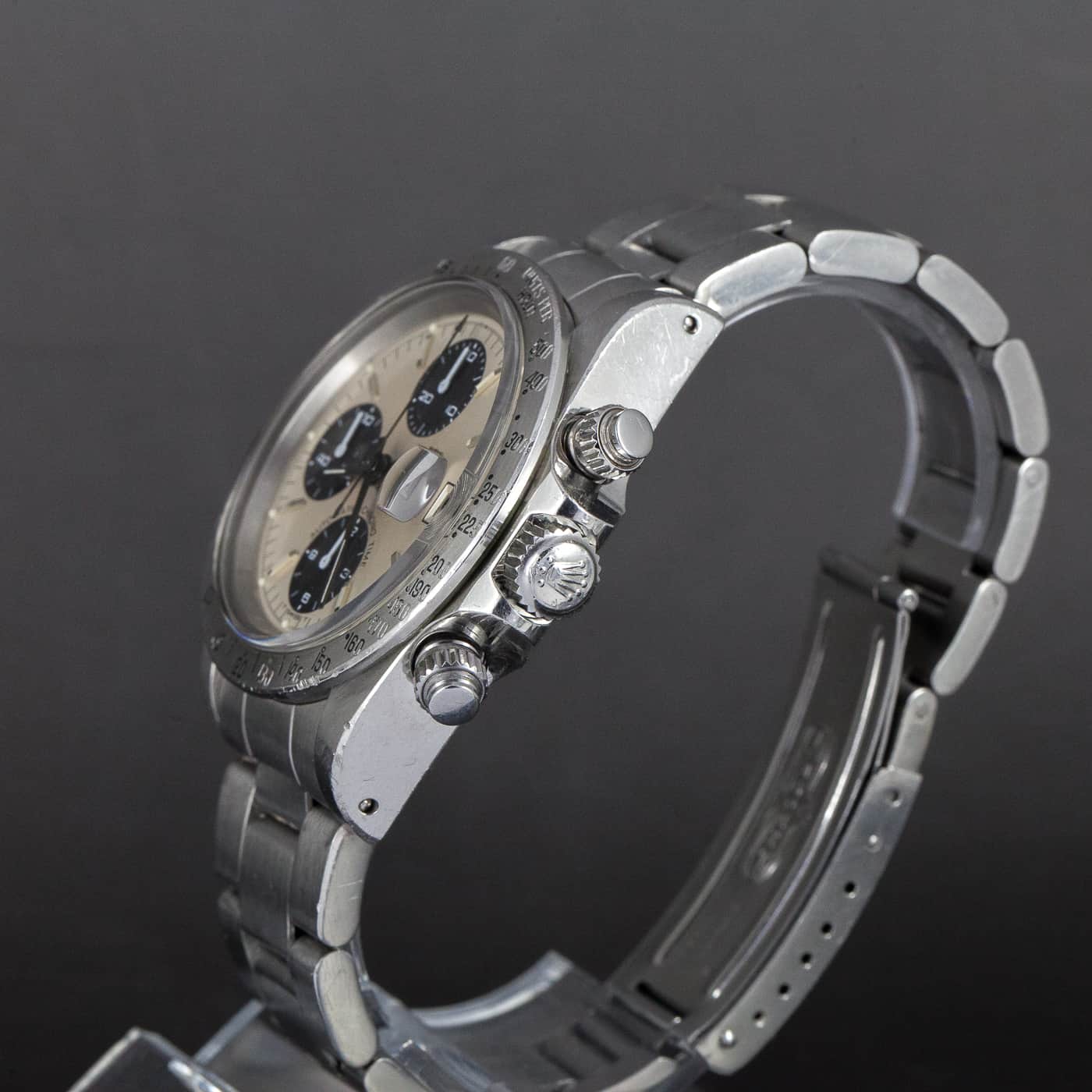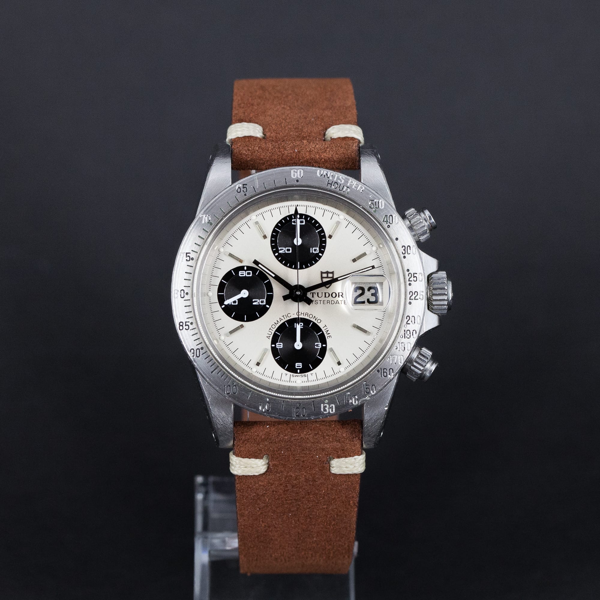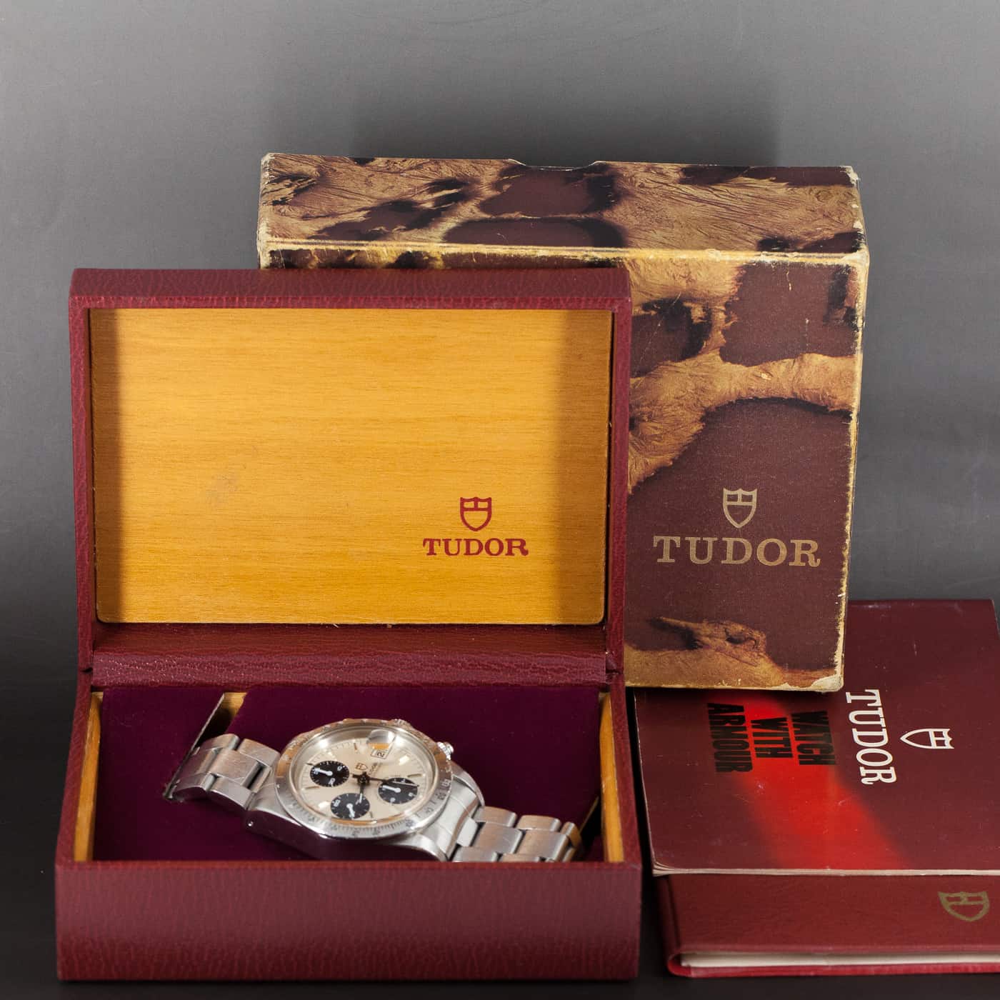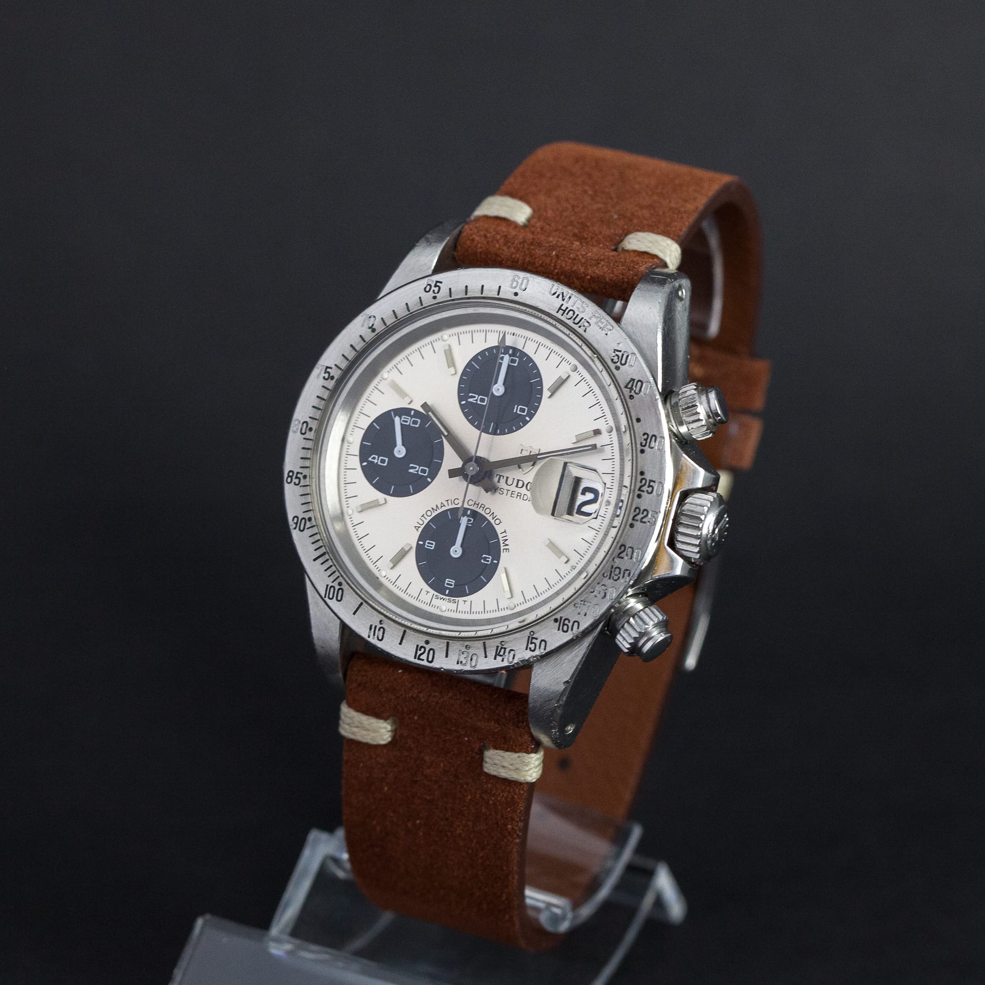Tudor ref. 94300 Oysterdate Automatic Chrono-Time ”Big Block” kronografi. Harvinainen täysin hiomaton ja alkuperäinen yksilö vuodelta 1985. Laatikko ja papereita, open-todistus. Hankittu suoraan ensimmäiseltä omistajalta. Täydellisesti kunnostettu Valjoux 7750 koneisto. Huollossa lasike ja tiivisteet on vaihdettu ja kello on yhä vesitiivis. Käsin ommeltu nahkaranneke sekä alkuperäinen teräsranneke Rolex ref.78360, 589 päätypaloilla (G-sarjaa). Kuoren sarjanumero on viisinumeroinen 145.. joka oli käytössä vain vuonna 1985 kun Tudor aloitti sarjanumeroinnin alusta.