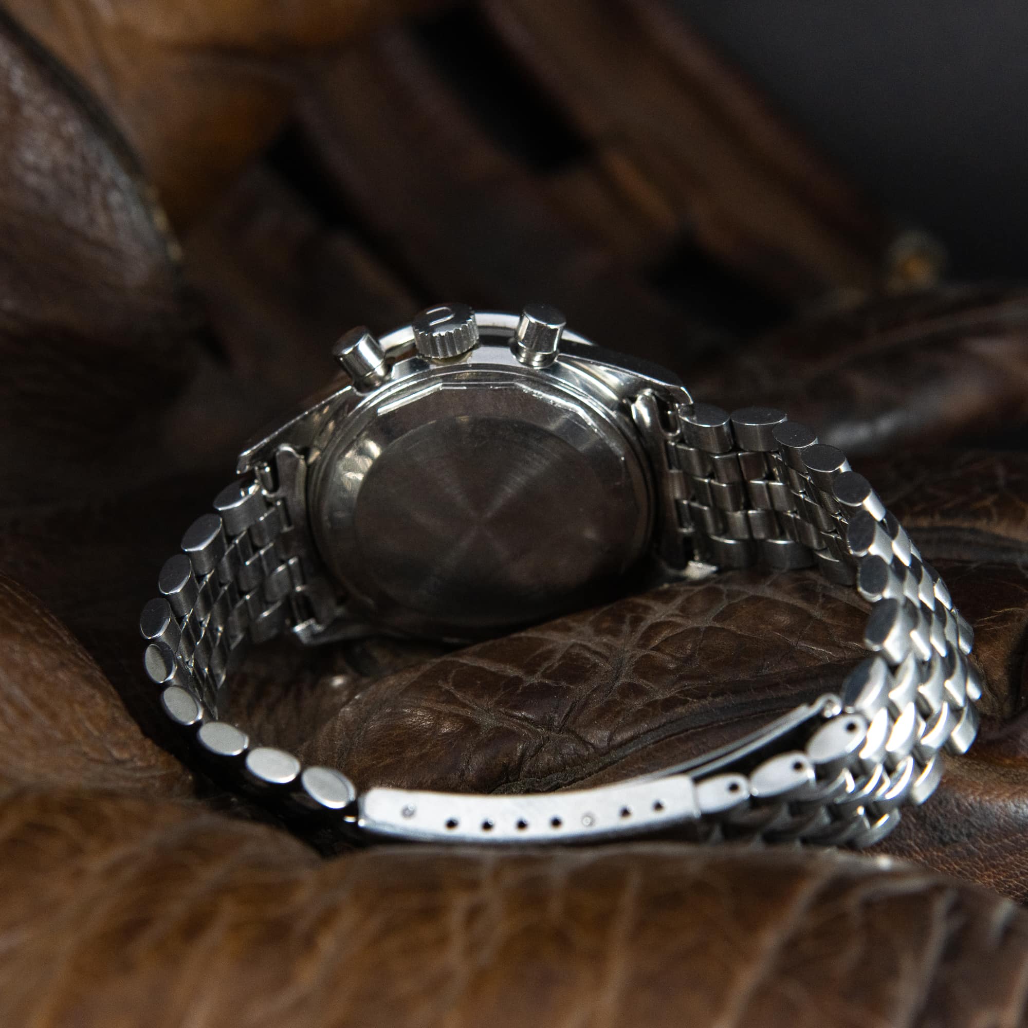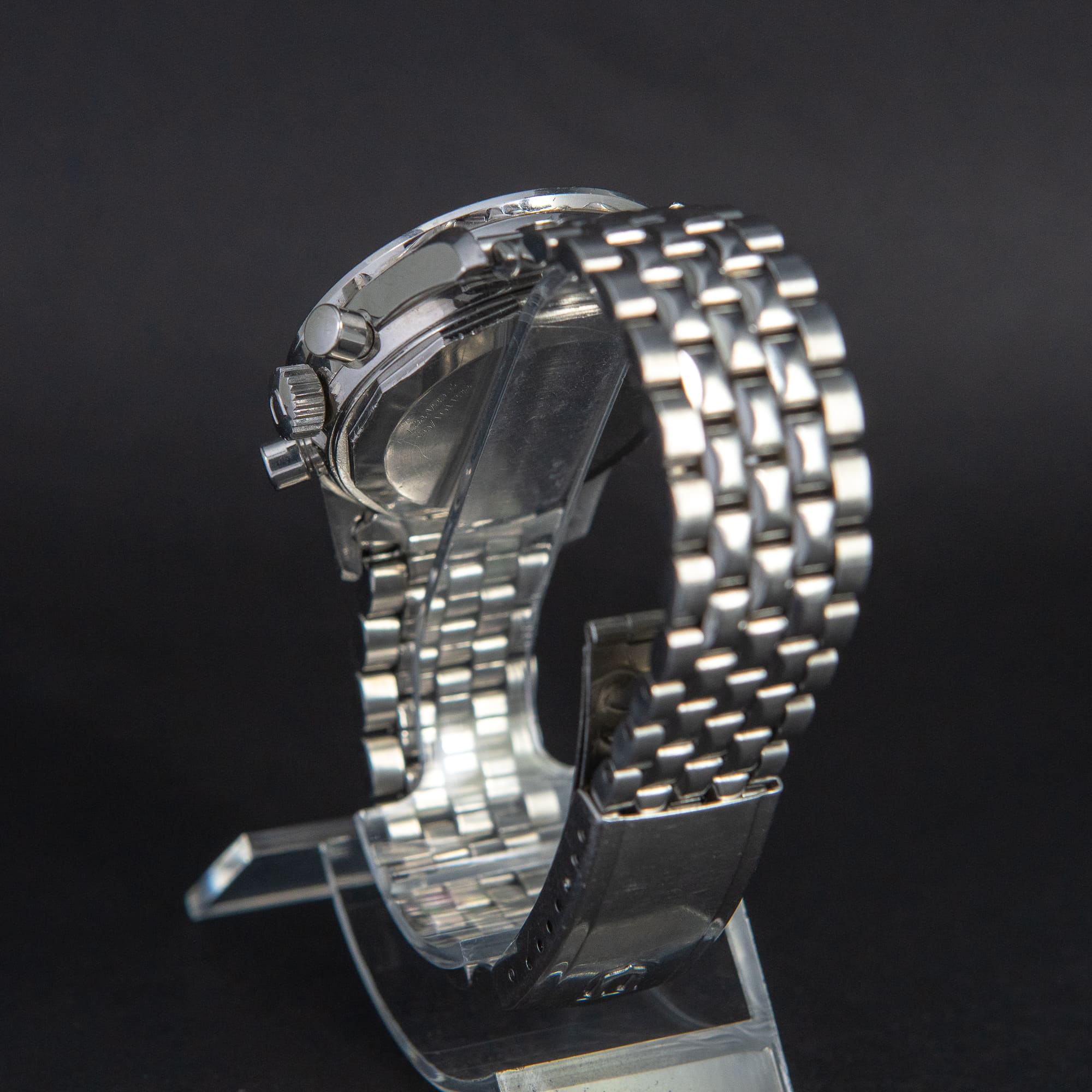 Hyvin harvinainen Universal Tri-Compax ”Exotic Slate” vuodelta 1968-69. Ref. 81101/3. Täysin alkuperäinen kokonaisuus. Alkuperäinen musta takymetri bezel, tritum kellotaulu ja -osoittimet. Kellotaulussa on normaalin aikanäytön lisäksi kronografi, kuukausi, kuukaudenpäivä, viikonpäivä ja kuunkierto. Kellossa on Martelin valmistama cal.281 manuaalivetoinen komplikaatio koneisto. Alkuperäinen Universal teräsranneke. Takapohjassa on selvästi näkyvissä ref. ja sarjanumero. Ei laatikkoa/papereita. Kuoren koko on 36mm.