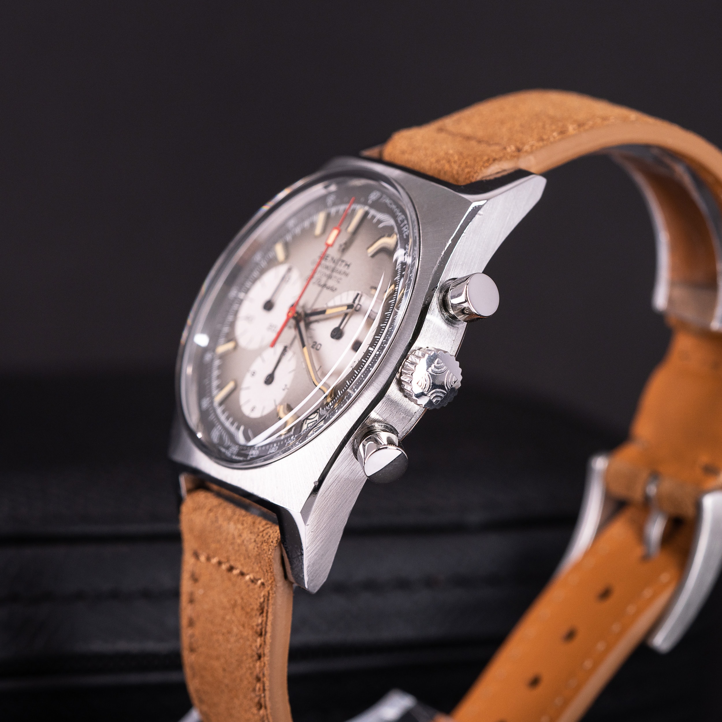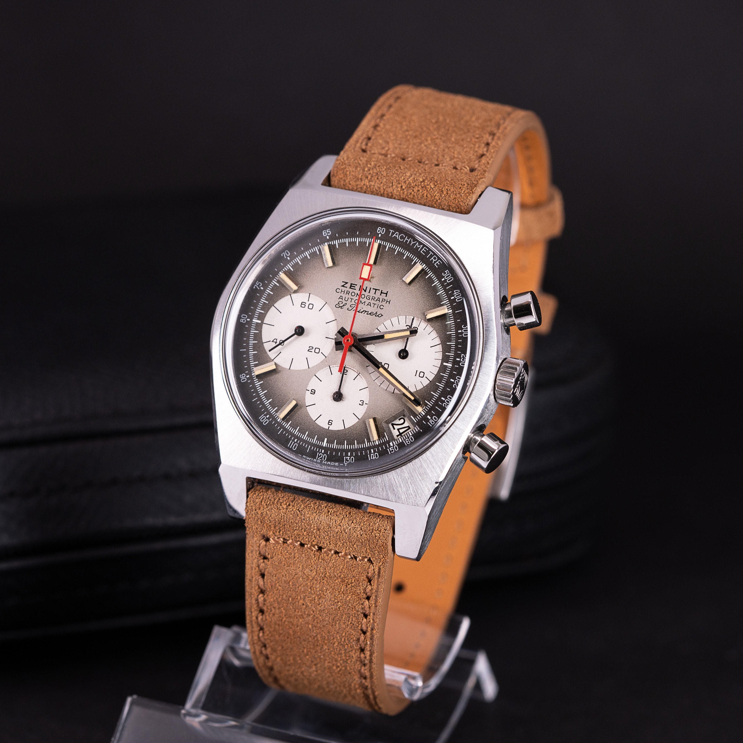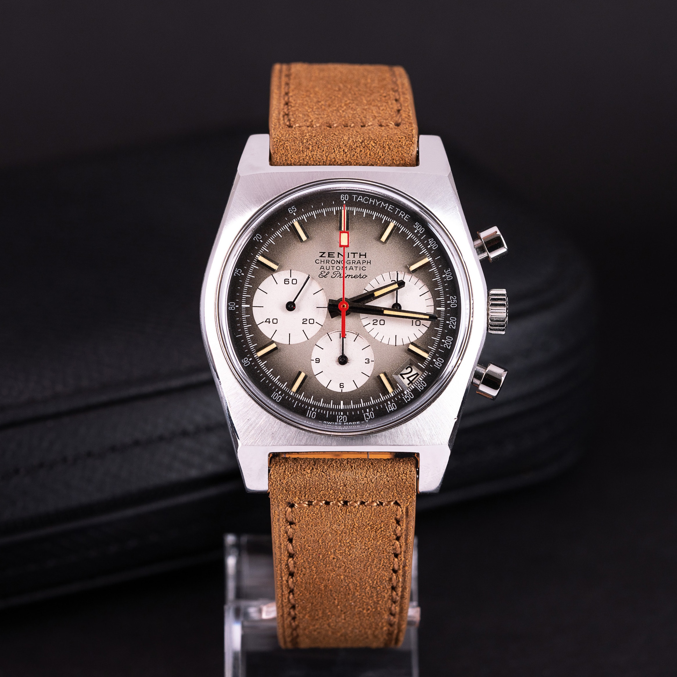 Harvinainen ja kaunis Zenith El Primero A385 automaattikronografi noin vuodelta 1969. Kellossa on virheetön ja kauniisti ikääntynyt alkuperäinen ruskea fume-kellotaulu tritium indekseillä ja alkuperäisillä tritium osoittimilla. Teräskuori on huippukunnossa. Kuoren koko on 37mm.