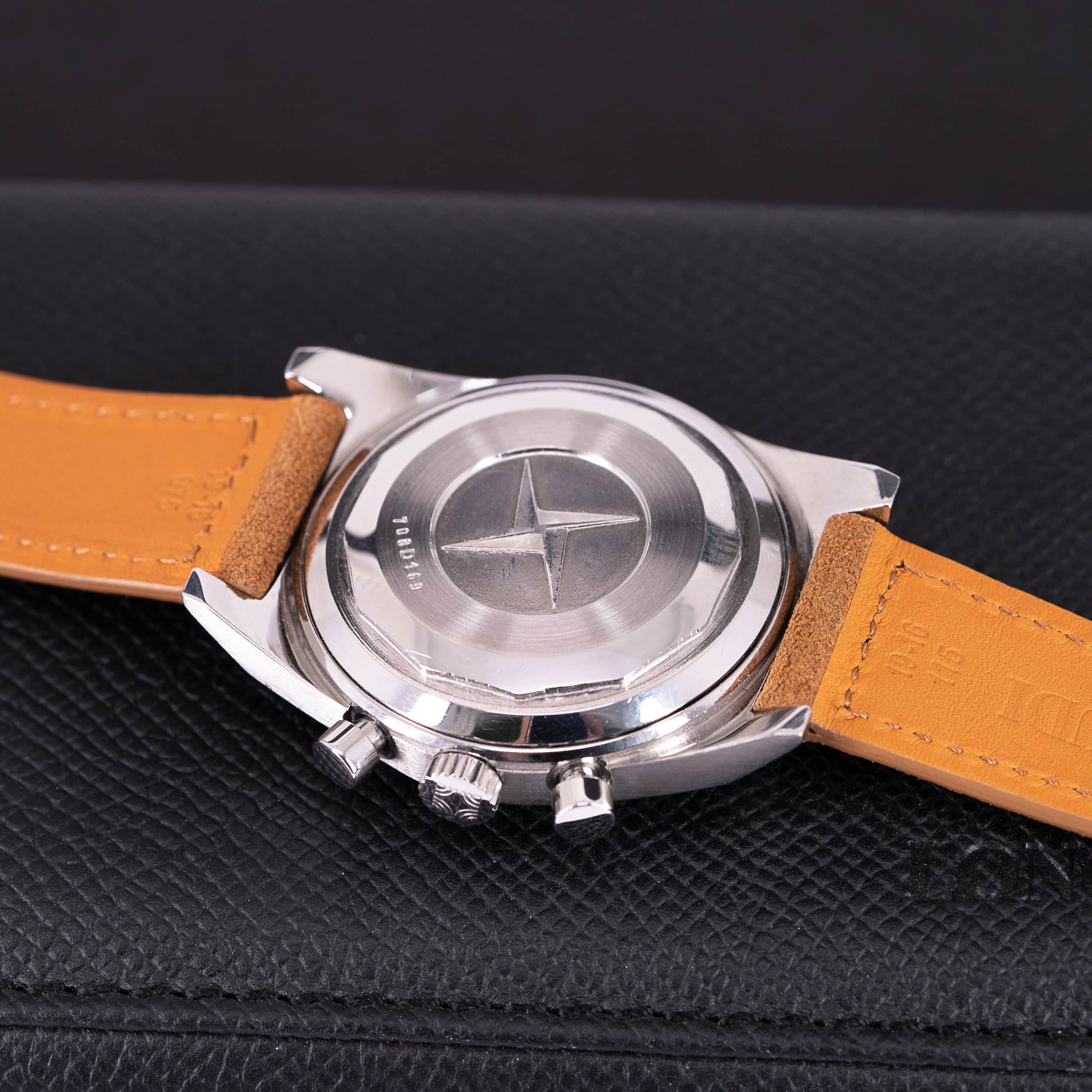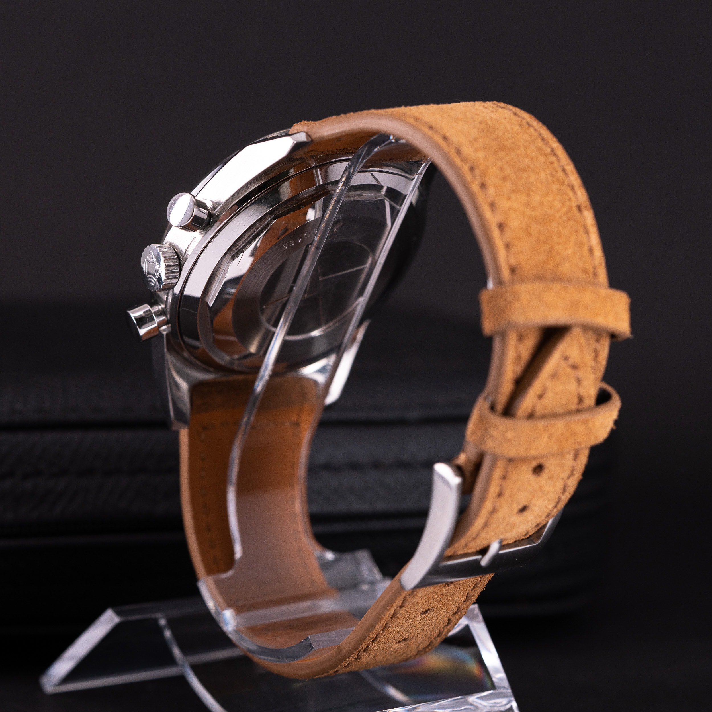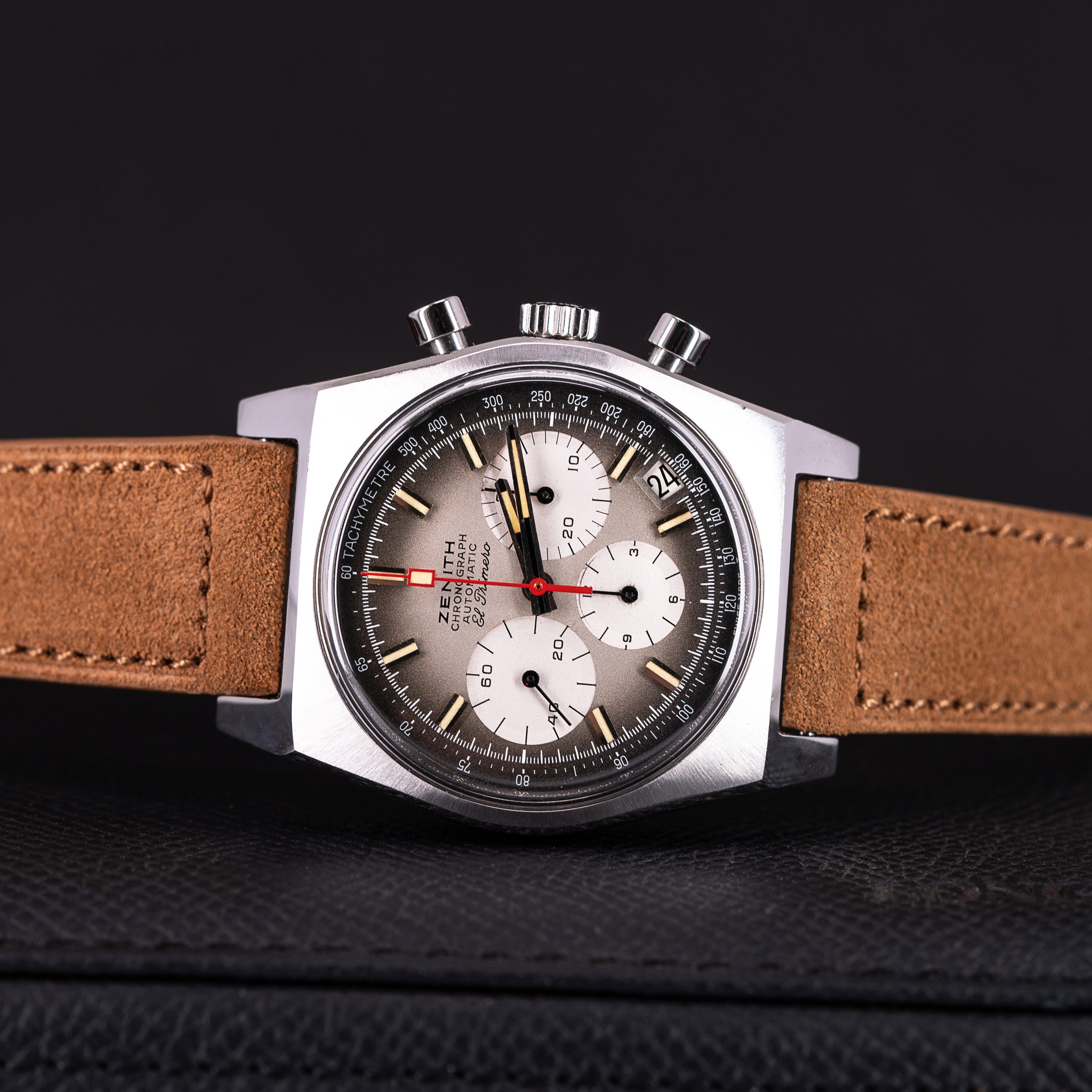 Harvinainen ja kaunis Zenith El Primero A385 automaattikronografi noin vuodelta 1969. Kellossa on virheetön ja kauniisti ikääntynyt alkuperäinen ruskea fume-kellotaulu tritium indekseillä ja alkuperäisillä tritium osoittimilla. Teräskuori on huippukunnossa. Kuoren koko on 37mm.